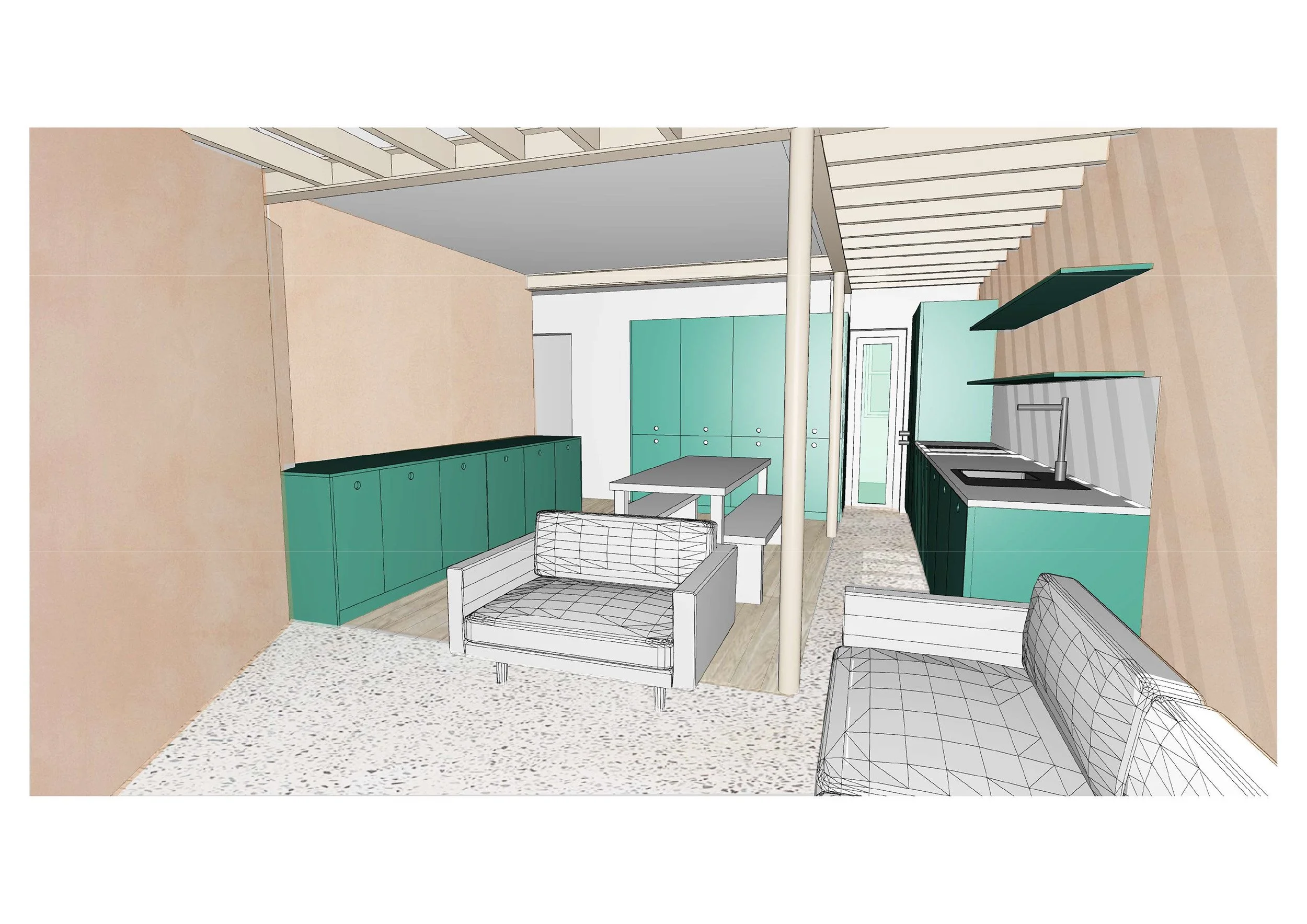 New economical materials of breathable raw plaster, ply and a polished concrete floor with exposed aggregate will form the internal palette. Exposed timber rafters under the 3m rooflight will cast playful shadows through the day.
